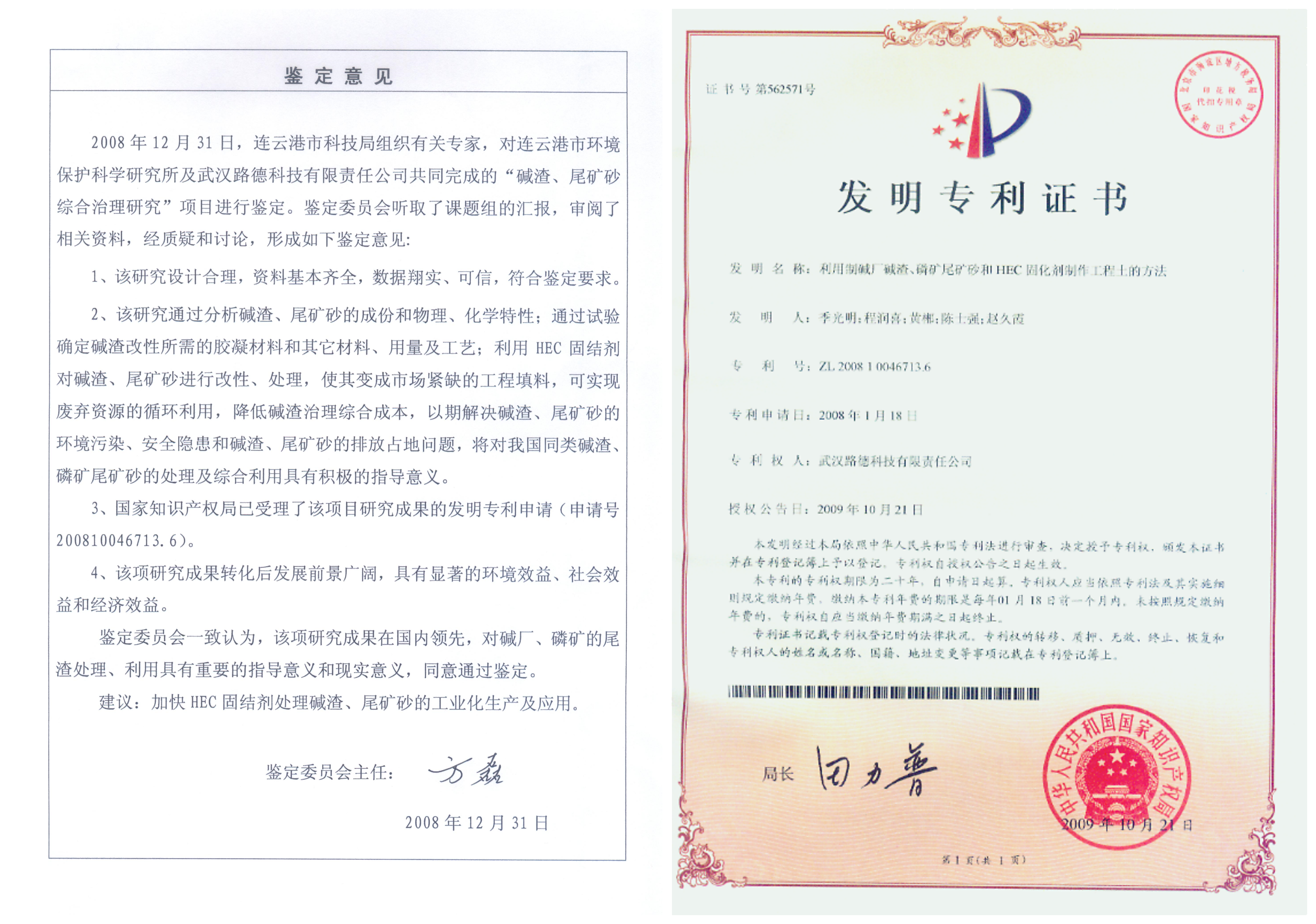 2009年10月21日,該技術(shù)又摘得一項(xiàng)桂冠:國家知識(shí)產(chǎn)權(quán)局授予的國家發(fā)明專利證書(“利用制堿廠堿渣、磷礦尾礦砂和HEC固化劑制作工程土的方法”、發(fā)明專利號(hào)ZL200810046713.6)。