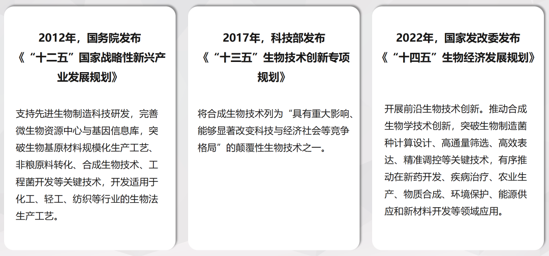 在我國(guó),從“十二五”國(guó)家提出支持先進(jìn)生物制造科技研發(fā),到“十三五”國(guó)家將合成生物技術(shù)列為引領(lǐng)產(chǎn)業(yè)變革的顛覆性技術(shù)之一,再到“十四五”明確表示“要有序推動(dòng)合成生物技術(shù)在新藥開發(fā)、疾病治療、農(nóng)業(yè)生產(chǎn)、物質(zhì)合成、環(huán)境保護(hù)、能源供應(yīng)和新材料開發(fā)等領(lǐng)域應(yīng)用”,一直以來,隨著國(guó)家持續(xù)出臺(tái)政策予以大力支持,我國(guó)合成生物產(chǎn)業(yè)擁有廣闊的發(fā)展前景。