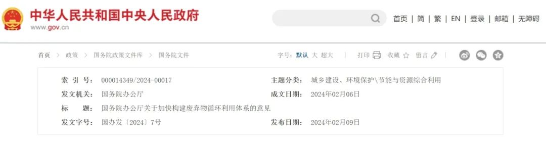 春節(jié)前夕,國務(wù)院辦公廳發(fā)布《關(guān)于加快構(gòu)建廢棄物循環(huán)利用體系的意見(點(diǎn)擊閱讀政策原文)》(國辦發(fā)〔2024〕7號(hào),以下簡稱《意見》)。