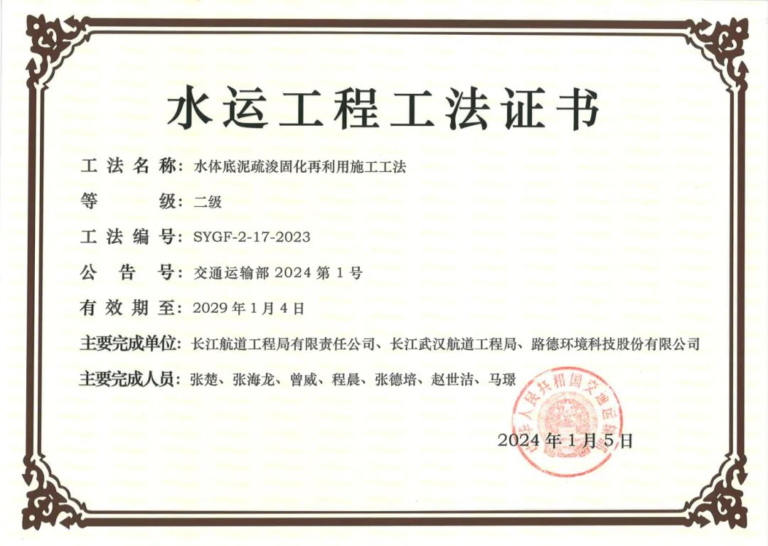近期,交通運(yùn)輸部公布了2023年度水運(yùn)工程工法評審結(jié)果,路德環(huán)境聯(lián)合長江航道工程局有限責(zé)任公司、長江武漢航道工程局共同申報的“水體底泥疏浚固化再利用施工工法”榮獲交通運(yùn)輸部2023年度水運(yùn)工程二級工法。