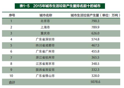 246個(gè)大、中城市中,城市生活垃圾產(chǎn)生量居前10位的城市見(jiàn)下表。城市生活垃圾產(chǎn)生量最大的是北京市,產(chǎn)生量為790.3萬(wàn)噸,其次是上海、重慶、深圳和成都,產(chǎn)生量分別為789.9萬(wàn)噸、626.0萬(wàn)噸、574.8萬(wàn)噸和467.5萬(wàn)噸。前10位城市產(chǎn)生的城市生活垃圾總量為5078.6萬(wàn)噸,占全部信息發(fā)布城市產(chǎn)生總量的27.4%。