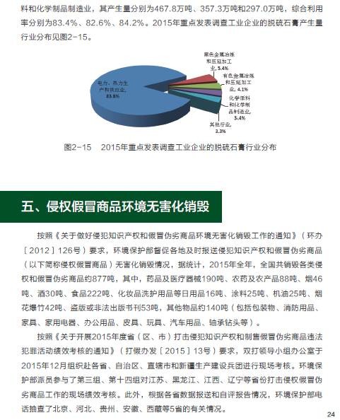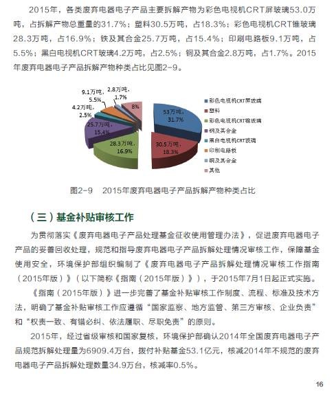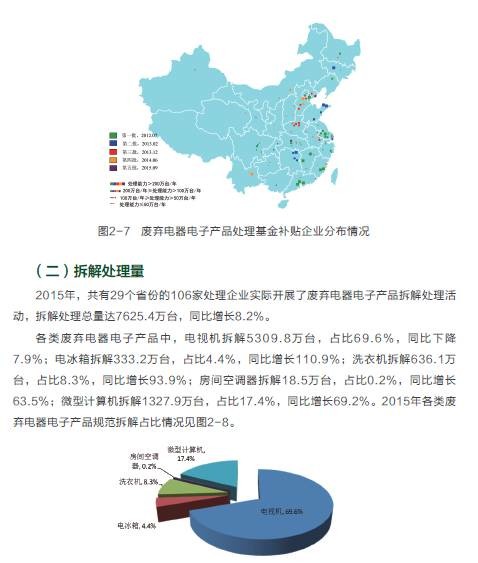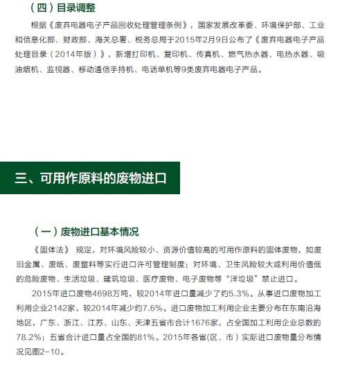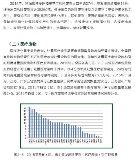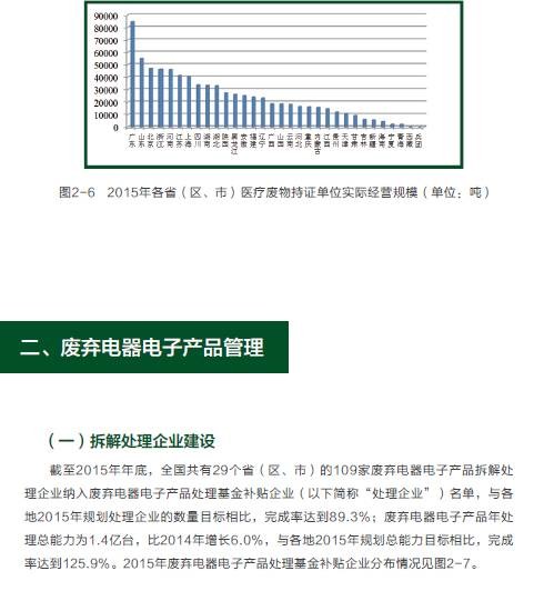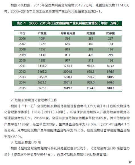 2015年,在危險(xiǎn)廢物污染防治工作方面,全國(guó)各?。▍^(qū)、市)頒發(fā)的危險(xiǎn)廢物經(jīng)營(yíng)許可證共2034份,經(jīng)營(yíng)單位核準(zhǔn)利用處置規(guī)模已達(dá)到5263萬(wàn)噸/年,實(shí)際經(jīng)營(yíng)規(guī)模為1536萬(wàn)噸;持續(xù)深入開(kāi)展危險(xiǎn)廢物規(guī)范化管理督查考核工作,各環(huán)境保護(hù)督查中心共抽查1509家企業(yè),整體抽查合格率為79.0%,比2014年提高4.1個(gè)百分點(diǎn)。在電子廢物污染防治方面,全國(guó)共有29個(gè)省(區(qū)、市)的109家廢棄電器電子產(chǎn)品拆解處理企業(yè)納入廢棄電器電子產(chǎn)品處理基金補(bǔ)貼企業(yè)名單,廢棄電器電子產(chǎn)品年處理總能力為1.4億臺(tái),實(shí)際拆解處理總量達(dá)7625.4萬(wàn)臺(tái),同比增長(zhǎng)8.2%。在可用作原料的廢物進(jìn)口方面,2015年進(jìn)口廢物4698萬(wàn)噸,同比減少約5.3%;從事進(jìn)口廢物加工利用企業(yè)2142 家,同比減少約7.6%。