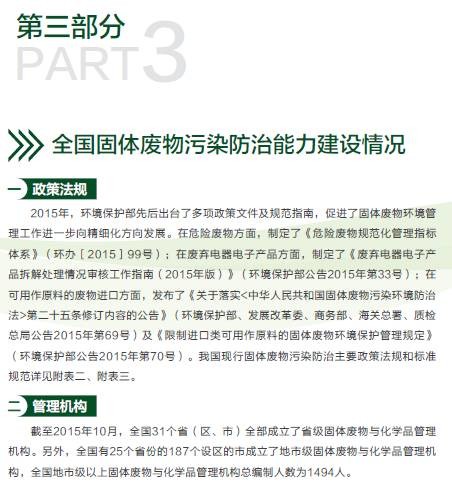 《年報(bào)》還介紹了我國(guó)現(xiàn)行固體廢物污染防治主要政策法規(guī)、固體廢物管理機(jī)構(gòu)能力建設(shè)情況、固體廢物管理技術(shù)培訓(xùn)情況以及固體廢物污染防治相關(guān)科研成果。并選擇4個(gè)代表性省份,介紹了他們?cè)诮鉀Q固體廢物管理重點(diǎn)、難點(diǎn)問(wèn)題方面的經(jīng)驗(yàn)和做法。
